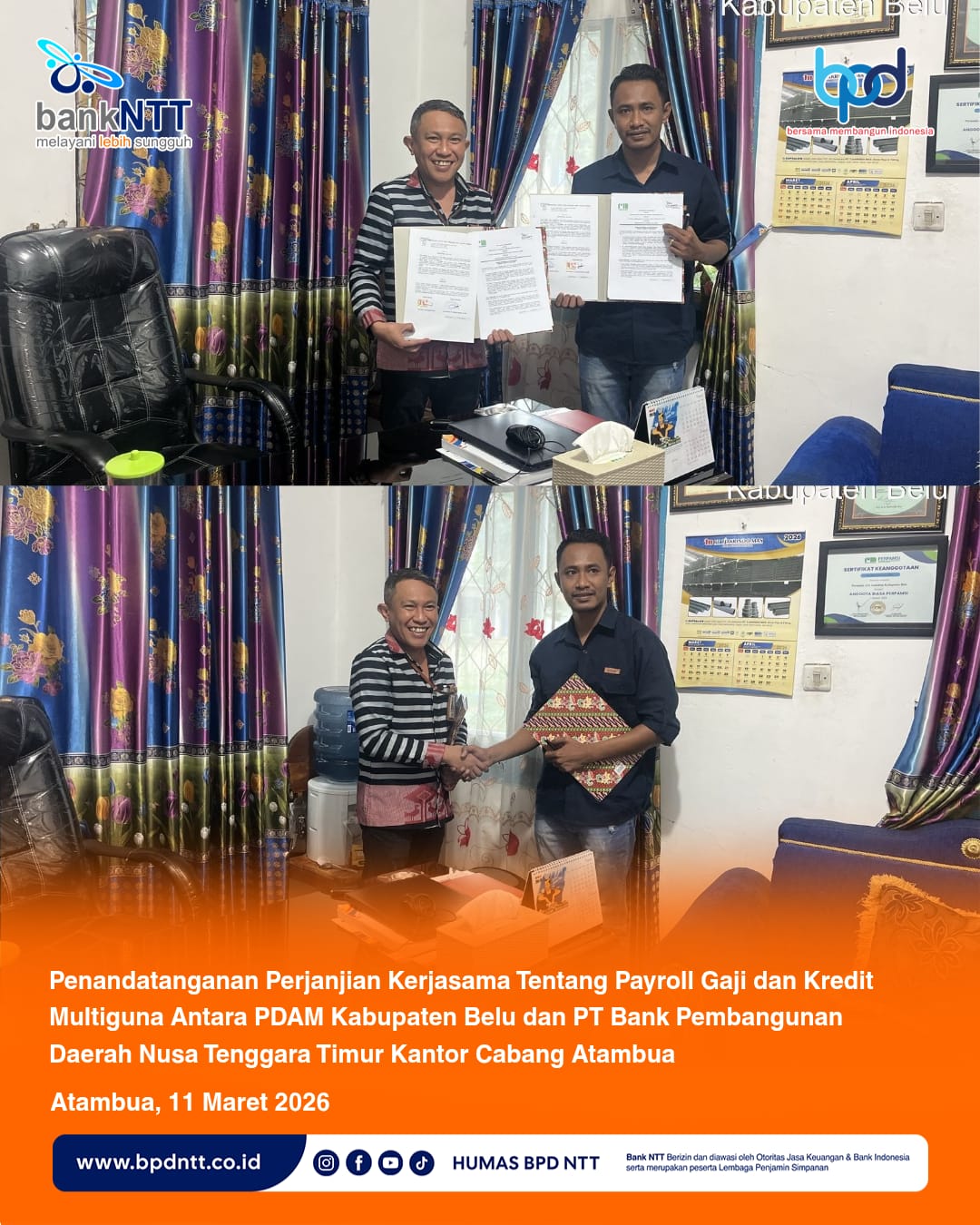 BELU-Arahntt.com- Bank NTT Cabang Atambua resmi menjalin kerja sama strategis dengan Perusahaan Umum Daerah (Perumda) Air Minum Atambuan, Senin (16/3/2026).