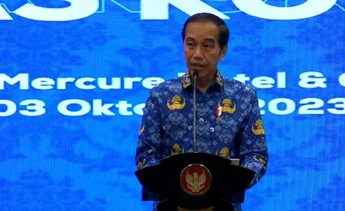 “Dengan mengucap Bismillahirrahmanirrahim, pada pagi hari ini secara resmi saya buka rapat kerja nasional (Rakernas) Korps Pegawai Republik Indonesia (Korpri) 2023,” ucap Jokowi.