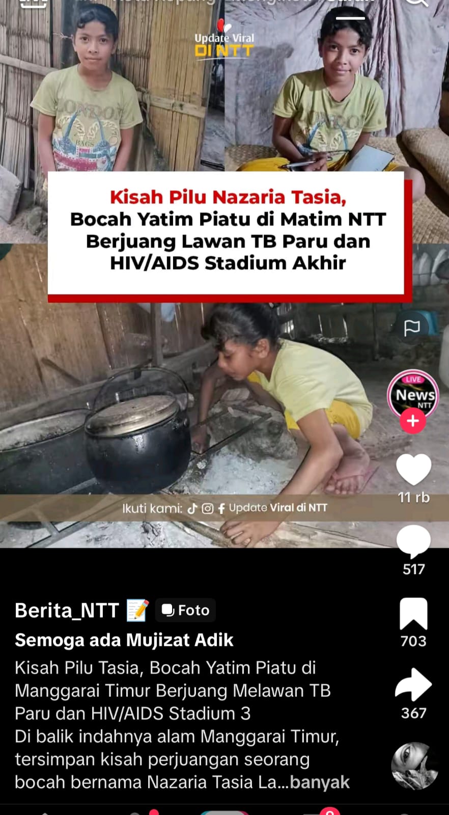 Borong Arahntt.com-, Kisah pilu yang dialami Nazaria Tasia Laka, bocah yatim piatu berusia 11 tahun yang berjuang melawan TB Paru dan HIV/AIDS stadium 3, akhirnya mendapat perhatian serius dari Pemerintah Provinsi Nusa Tenggara Timur.