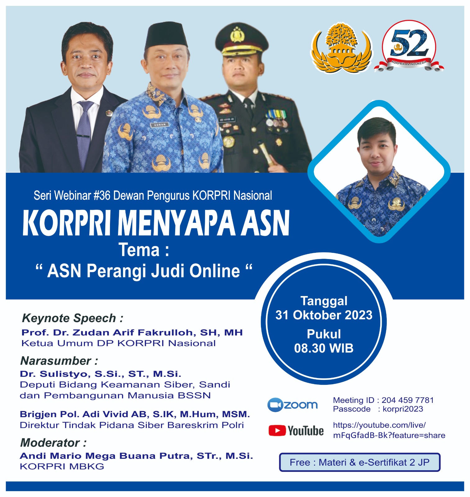 Untuk membahas isu hangat ini, webinar menghadirkan Ketua Umum DP KORPRI Nasional, Prof. Dr. Zudan Arif Fakrulloh, SH, MH., sebagai Keynote Speech dan dua narasumber yang menangani langsung problem judi online, yaitu Dr. Sulistyo, S.Si., ST., M.Si., Deputi Bidang Keamanan Siber, Sandi dan Pembangunan Manusia BSSN dan AKBP Irvan Reza, S.H., S.I.K., dari Direktorat Tindak Pidana Siber Bareksrim POLRI serta dipandu oleh moderator Andi Mario Mega Buana Putra, S.Tr, M.Si, dari KORPRI BMKG