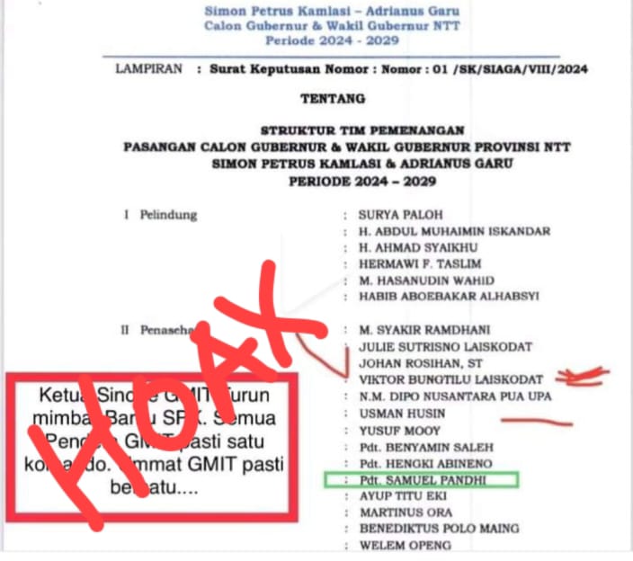 “Saya baru menelpon salah satu staf dari Pak Simon Petrus Kamlasi bahwa SK itu tidak benar. Itu editan. Tidak ada nama Ketua Sinode GMIT sebagai salah satu Penasehat Tim Pemenangan Paslon tersebut,” kata Pdt. Pace seperti dilansir dari media GMIT, Senin (30/9/2024).