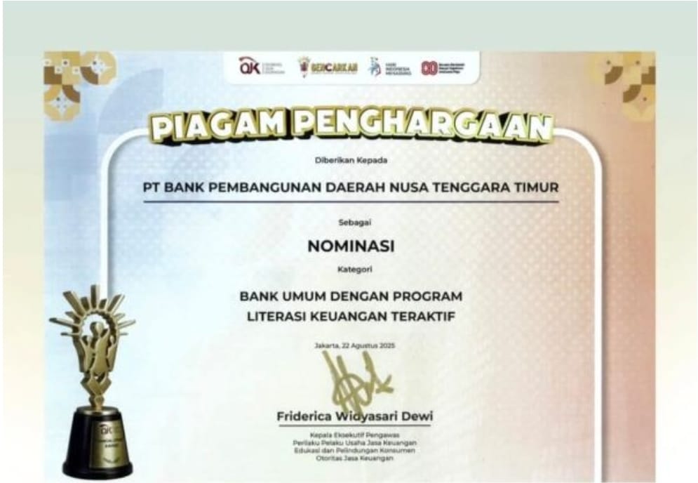 KUPANG,Arahntt.com- PT Bank Pembangunan Daerah Nusa Tenggara Timur (Bank NTT) kembali menorehkan prestasi di tingkat nasional. Bank kebanggaan masyarakat NTT ini meraih nominasi pada ajang Financial Literacy Award 2025 yang digelar oleh Otoritas Jasa Keuangan (OJK) di Jakarta, Jumat (22/8/2025).
