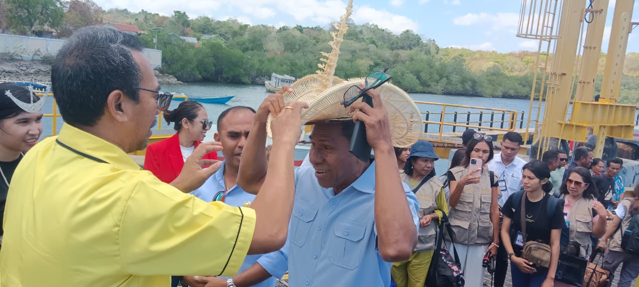 Johni tiba di Pelabuhan Feri Pantai Baru sekitar pukul 11.00 Wita dan disambut sejumlah pimpinan parpol yang tergabung dalam Koalisi Indonesia Maju, langsung dipakaikan Ti’i Langga, topi tradisional khas Rote serta dikalungi selendang.